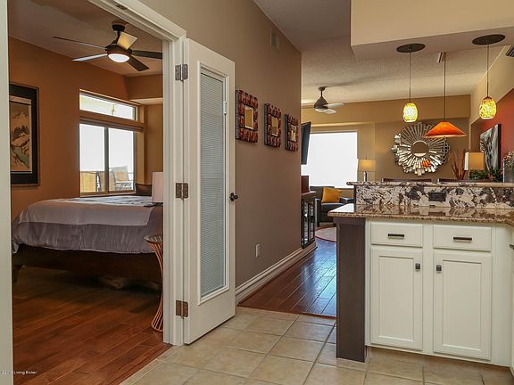 10th floor UPDATED with Custom Finishes 2 bed/2 bath condo READY for you! Great River & SKYLINE views and premier location for Thunder Over Louisville with the everyday convenience of walking to multiple restaurants & entertainment options. The kitchen has beautiful finishes such as granite, stainless appliances, tile backsplash; bar height breakfast/wine bar extends from kitchen with wine fridge & storage. Hickory floors in living, dining & bedrooms. There are custom transom windows above balcony doors & window expanding the light & views. Enter the master bathroom through the modern double barn track doors with ribbed glass panels.