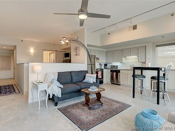 Welcome to THE HARBOURS - This sought-after community offers an unparalleled lifestyle with its blend of luxury, convenience, and stunning view of the Ohio River and Louisville Skyline. This fully furnished 1 bed/1 bath studio is beautifully updated. Large format tile floors flow throughout the condo. The kitchen features light grey cabinets w/quartz counters, white tile backsplash & stainless appliances. The living room has unobstructed views of the Louisville skyline with glass across the entire front of the condo. Bonus Phantom Screen on sliding door. The corner unit has an east facing window in the dining area providing additional views. Step up to the bedroom platform w/wall mounted scones & large walk-in closet. The bath features a newly added barn door. The laundry is immediately to the left with stack washer/dryer. The tub/shower is on the right. The large vanity has grey paint & quartz counters. Deeded parking space 518 is right by the building entry. Seller is offering a Home warranty. Unsurpassed location for Thunder Over Louisville, walk to multiple restaurants & entertainment options. Whether you're seeking a tranquil retreat or a vibrant urban lifestyle, you'll find it all at The Harbours Condominiums. Premier property with gated entries, fitness center, indoor & outdoor pools, grills on-site, patio/gazebo areas. Monthly HOA covers amenities, cable, high speed internet, HBO, Showtime, water, sewer, trash, water softener & master insurance.