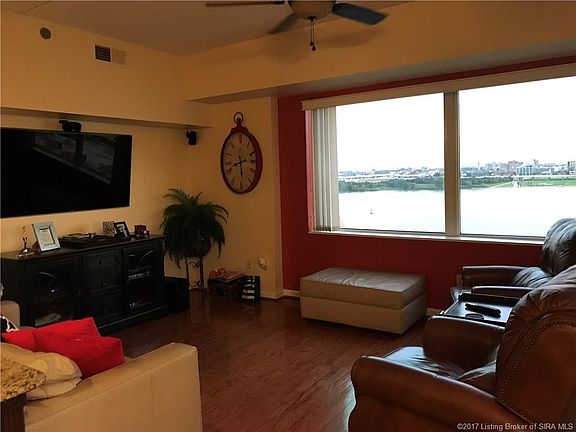 This gorgeous condo features a unique floor plan and is one of the most sought after units (only seven) in the building. A quiet corner west side unit which ovelrooks the pool, the river, Louisville skyline and west view of the Knobs. The gourmet kitchen features custom cabinets, beautiful granite, upscale appliances and a breakfast bar. Two beautiful large bedrooms each have walk-in closets, formal dining room and mirrored accent walls in kitchen/dining area. Very exquisite decor with each detail carefully selected and masterly finished. All high-end furniture and appliances included! This condo was one of the first to be featured as "Home of the Week" in the Louisville Courier Journal. A great location in the building with two prime side-by-side covered parking spaces ideally located close to elevator on 1st floor - allowing in and out of the garage quickly! Amenities include indoor and outdoor pool, state of the art fitness center, business center, pavilion with gas grills for entertaining, doggie walk and within walking distance to several restaurants and outdoor entertainment. Maintenance fees include high speed internet and cable TV. Don't miss out on this one, it will go fast. Call today for your private showing.