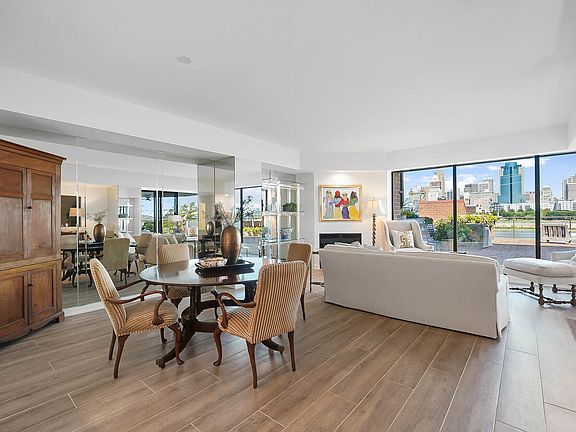 Experience riverfront living at its finest in this stunning condo with sweeping 180º views of the Ohio River, the Roebling Bridge, Reds Stadium and the Cincinnati skyline from a 1200 SF terrace. Floor-to-ceiling windows and sliding doors frame the ever-changing cityscape, creating a spectacular backdrop for everyday living and entertaining. The spacious open floor plan flows effortlessly from the bright living room with fireplace to the dining area and out to an expansive terrace—perfect for dining al fresco or watching fireworks over the river. A sleek, updated kitchen features crisp white cabinetry, quartz counters, and stainless appliances. The primary suite offers a private enclosed balcony overlooking the water, generous closet space, and a well-appointed bath. A second bedroom and bath provide flexibility for guests or a home office. The convenience of in-unit laundry adds to the comfort of carefree living. Located in the heart of Covington's historic Riverside District, this home offers unmatched walkability to dining, entertainment, and stadiums. Secure parking and an unbeatable location make this a rare opportunity to live steps from the river with panoramic skyline views