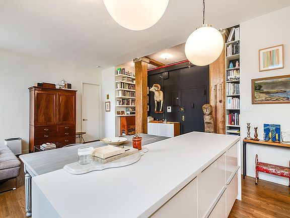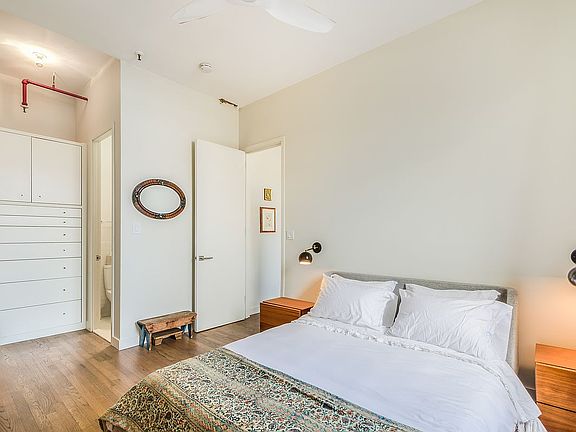 Welcome to One Rockwell Place 2D, a thoughtfully restored 2bd/2bth condominium loft in historic Fort Greene. Features include 11 ft high ceilings, built-in bookshelves, tons of storage, radiant heat, exposed wood beams with cast iron fittings, and five (5) huge (4' x 8') North-facing windows bringing in sunlight all day long! A top-to-bottom renovation in 2017 included: new plumbing and mechanicals, all new bathrooms with high-end fixtures, custom 8ft doors and brushed solid nickel hardware, seamless refinished solid oak floors with custom zero-VOC finish, and Restoration Hardware/Schoolhouse Electric lighting. The new kitchen is a dream to cook in with built-in cabinetry, tasteful marble tile backsplash, luxury European appliances (Miele, Bosch, Bertazonni), and a large island with solid Corian waterfall counter. The renovated primary bedroom - complete with luxurious new en suite bath - has custom closets and built-ins providing carefully considered storage. A walk-in utility/storage area with in-unit washer/dryer, tons cabinetry and shelving, plus a pantry adds to the long list of meticulously considered features - with an eye toward sustainability - that make for gracious living.