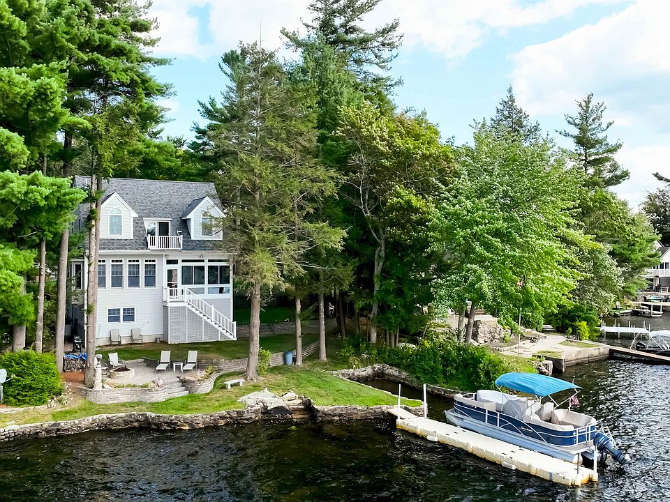 Big Island Pond waterfront home. Move in and enjoy the spectacular water view of the main lake from this well kept contemporary cape style home. Comfortable open concept flowing floor plan with windows to soak up the views. Formal living room accented by wood flooring and with glass doors leading to 3 season porch. Cherry cabinets in the great working kitchen - granite counters and center island with breakfast bar all accented by the view. Primary bedroom - vaulted ceiling - private deck overlooking lake plus an office or den off of room - primary bath with soaking tub and walk in shower. Laundry room & powder room.Central A/C, On Demand generator.Interior sprinkler system. Potential for more living space above garage. Nice landscaped waterfront lot with walk ways leading to the lake.2 car attached garage.Newer heating system(4yrs old) and roof(4yrs old). New leach field & pump installed May 2021. Enjoy lake life in this well kept waterfront home. A must see!