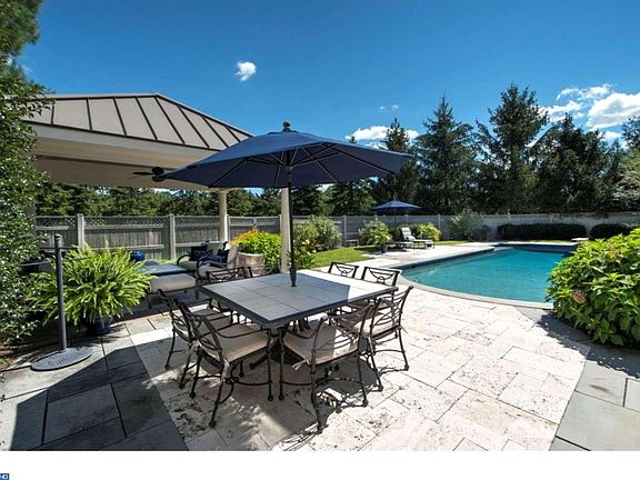 Imagine yourself in this exquisite four Bedroom Home in the sought after Meadowood neighborhood at River Crossing in Upper Makefield. The picturesque setting for this handsome home offers beautiful landscaping with a well-designed combination of blue stone/limestone patios, pergola dining area, inviting pool cabana and a tranquil heated pool with waterfall spa. The beauty continues inside with a grand entryway showcasing refinished hardwood floors, turned staircase and upgraded wood trim. There is a wonderful flow to this home and many opportunities for entertaining in the spacious formal Dining Room and Living Room that presents a stunning view of Bowman's Tower. The comfortable Family Room with fireplace and large oversized windows leads to the two-story Breakfast Room. Enjoy fabulous views of the lush terraced patios from the spacious Sun Room with walls of windows, and vaulted ceiling. The Gourmet Kitchen offers granite countertops, an oversized island, butler's pantry, Viking Range, Sub-Zero fridge, Miele dishwasher and a large walk-in pantry. The fully finished walk-out basement has excellent space for entertaining including a custom built wet bar, TV space with extra bar area, billiard area, full bath, spare room which can be used as a home office, work out room or bedroom. The second level features a Master Suite with sitting room, two walk-in closets and Bath with soaking tub, shower and two sinks. Completing this floor are two additional Bedrooms sharing a Bath plus a fourth Bedroom with a private Bath. Other highlights featured in this home include a Laundry/Mud Room with an outside entrance, three Car Garage, parking court with decorative pavers, newer roof, 400 amp service, instant hot water, nine foot ceilings on first and second floors, and a first floor office with French doors. The breathtaking backyard landscaped by award winning architect Paul Dorko, Hidden Valley Nursery, has an irrigation system, lighting and outdoor speakers to elevate the space even further. Located in the award winning Council Rock School district, easy commute to 95 and has been magnificently maintained! Welcome home!