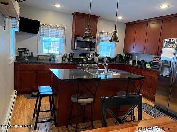 Beautiful updated 1.5 Story home in a beautiful and quiet area plus close to major highways and amenities. Great Room addition done in 2014 with vaulted pine ceiling, stone wood burning fireplace, sliding doors leading to stamped concrete patio and above ground pool. Radiant heated floor which extends into the foyer. Kitchen updated in 2014 with island, recessed lighting, new appliances and wood floor. First floor laundry area, Bedroom and full bath with tiled floor. Hardwood floors will be found under the carpeting. New 2020 energy efficient on demand propane wall unit for heat and hot water. 200 amp electric and new well pump in 2019. Detached garage has woodstove for heat and workshop area. A must see home. Excellent condition.