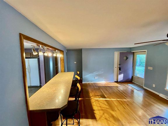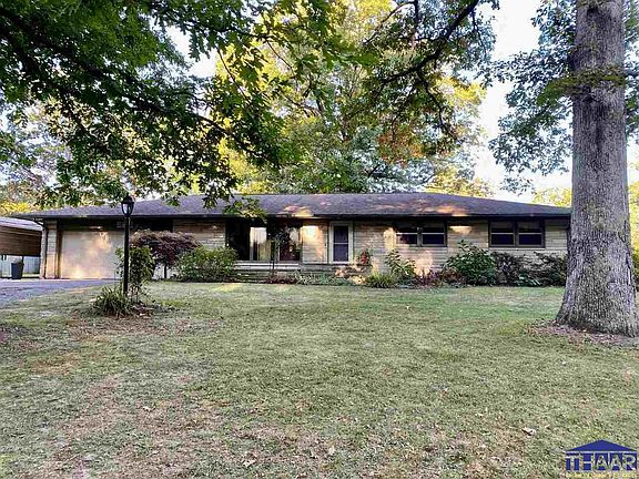 Beautiful Bedford stone ranch on a 1.53 acre corner lot! Convenient location in southern Vigo County that's in a great school district. Features lovely original hardwood floors, large cedar lined closets, built-ins and large windows! Open concept living and kitchen area that you'll love! Kitchen has maple cabinets, all appliances included and a huge breakfast bar. Updated bath with newer walk-in shower. Full basement is partially finished and the possibilities are endless! Nice two car attached garage w/new door & opener in 2020, 2018 carport, large shed and a chicken coop too! Large trees, newer deck, perennials, and garden space. Septic has two new pumps and a new water heater.