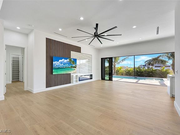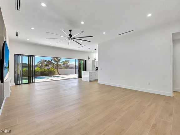 New Construction Modern Luxury Home. This NEW home features 2,433 SF with 4 Bedrooms, 3 Full bathrooms, and large 3 Car Garage. The Zeppelin Model comes loaded with features and upgrades rarely offered in most new homes, blending the lines between contemporary elegance and comfort. Step into soaring volume ceilings and a stunning slatted wood & tile feature wall with fireplace and 86” TV. Open concept with large plank tile, 10’ volume ceilings, linier vents, and a wall-to-wall 8 panel impact sliding glass doors overlooking the pool, palm trees, and tropical landscaping. Entertainer's Kitchen with Mitered Edge Quartz Countertops with full height backsplash, center island with waterfall edges, white shaker cabinetry, wall oven, stainless steel appliance package, modern pendant lighting, and transom windows for natural lighting. The master bedroom feels like you are staying at a luxury resort with views of the pool, hot tub, and palm trees! Master Bathroom feels more like stepping into a LUXURY SPA with his & her vanities, walk-in closet with custom shelving, and centered by a huge walk-in open shower with tub. Amble space for family, guests visiting, or even a home gym or office with 4 bed 3 bath. Even the guest bedroom closets have shelving! Your Oasis is completed by a incredible outdoor living space. Stunning full-length saltwater pool, sun shelf with bubblers, and integrated hot tub. High-end construction with full stucco ceilings, no soffits, large tie-beams for NO PILLARS obstructing your view and patio space, neutral grey paver decking, and an incredibly large picture window enclosure. Private fenced in yard with mature palm trees and upgraded landscaping package. “1” is sophistication, luxury, and functionality. It will make you excited to call this HOME and leave your guests and family breathless when they visit. City Water & Sewer in. Solid storm-resistant roofing, impact windows and doors, elevated new construction, built to be modern and safe. There is no comparison, this home features materials often reserved for high-end waterfront homes! BOATERS are located near several public boat launches/ramps and Matlacha for Gulf Access, open water, world famous fishing, beaches, and barrier islands. GOLFERS - Very close to Palmetto Pines Country Club and Coral Oaks. Close to shopping, dining, events, Starbucks, Target, Publix, and the area’s top-rated restaurants. Located near the future 7 Islands may include restaurants, shopping, marinas, a park, green space, and possibly even a beach area!
