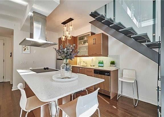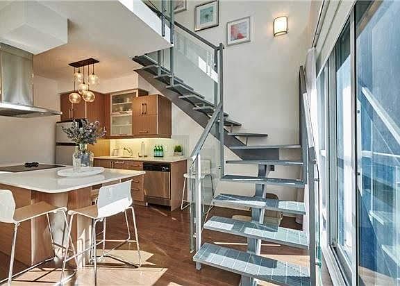 A spacious (~1100 sqft) two floor condo (1br + den, 1.5 bath) in a clean and well-maintained building in the heart of downtown Toronto. Easy walking distance to the TTC, Union Station, St. Lawrence Market, and all downtown amenities. Unit is on the 4th floor and sound insulated. Key unit highlights include: assigned storage locker and parking space, in-unit washer and dryer, full kitchen (dishwasher, oven, microwave etc.) including a kitchen island with lots of counter space, fully networked (cat5 network jacks) for home office work with highspeed fiber internet (many tenants use beanfield), juliet balcony overlooking the esplanade, one full bathroom with separate shower and tub, and a half bath for guests. Water and heat included in rental price. Building amenities include: 24h concierge, onsite management, gym, outdoor pool, library and reading room, 5th floor terrace open to tenants, and a bookable movie room and BBQs.