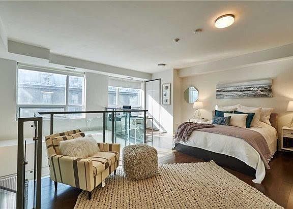 A spacious (~1100 sqft) upscale two floor condo (1br + den, 1.5 bath) in a clean and well-maintained building in the heart of downtown Toronto. Easy walking distance to the TTC, Union Station, St. Lawrence Market, and all downtown amenities. Unit is on the 4th floor and sound insulated. Key unit highlights include: assigned storage locker and parking space, in-unit washer and dryer, full kitchen (dishwasher, oven, microwave etc.) including a kitchen island with lots of counter space, fully networked (cat5 network jacks) for home office work with highspeed fiber internet (many tenants use beanfield), juliet balcony overlooking the esplanade, one full bathroom with separate shower and tub, and a half bath for guests. Water and heat included in rental price. Building amenities include: 24h concierge, onsite management, gym, outdoor pool, library and reading room, 5th floor terrace open to tenants, and a bookable movie room and BBQs.