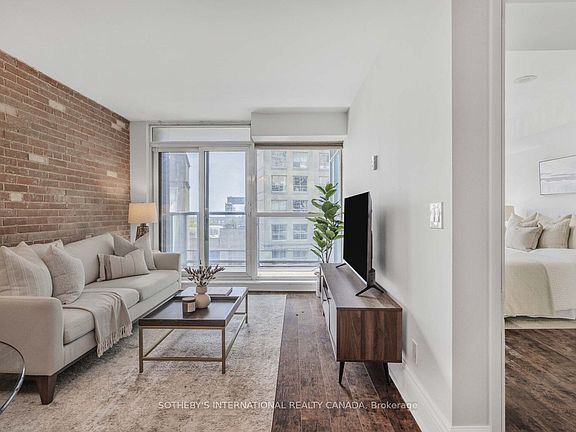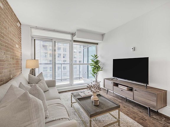 A true must see Condo located in one of the best buildings in the heart of downtown. This fantastic One Bed + Den offers the perfect blend of convenience and luxury living. Property features 9' ceilings, custom brick accent wall, floor-to-ceiling window/door opening to south facing balcony with beautiful city and water views. Bedroom is generous in size, comfortably fitting a king bed. The versatile Den can be used as a second bedroom, office, or both, leaving you flexibility to customize to your lifestyle. Open concept kitchen and living is filled with great natural light throughout the day and provides the perfect space for family time or entertaining. Enjoy an impeccable walk and transit score of 100 with steps to Union station, TTC, the Financial District, St. Lawrence Market, 24-Hour Metro and No Frills, supermarkets, theatres, restaurants, shops, bars and other entertainment options just steps away. Top-notch amenities include a 24-hour concierge, an outdoor pool, a movie theatre, a library, guest suites and a gym. This condo really has it all, so come and see your future home!