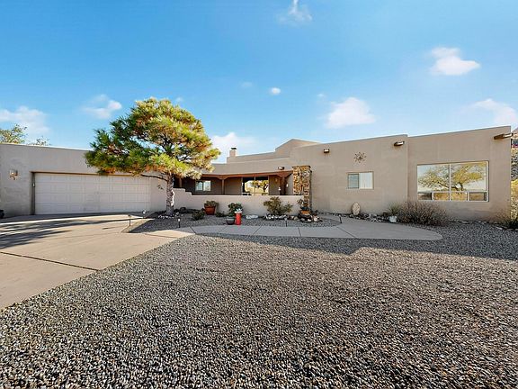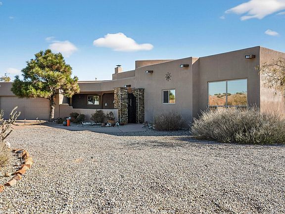 MOTIVATED SELLER!Charming Pueblo-style home on 1.36 acres with Sandia Mountain views. Features include a spacious great room with kiva fireplace and vigas, open floor plan, ductless HVAC, and concrete/tile floors. The 3-bedroom, 2-bath layout offers a private primary suite, well-sized kitchen, and finished 2-car garage. Enjoy peaceful outdoor living with native landscaping, and privacy wall. Located on a quiet cul-de-sac in scenic Placitas with easy access to Albuquerque and hiking trails.