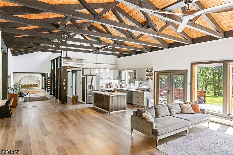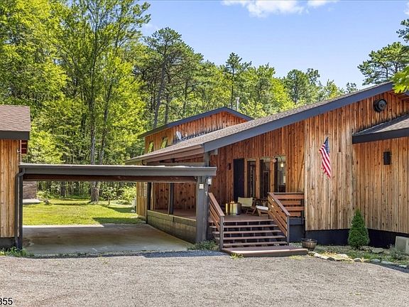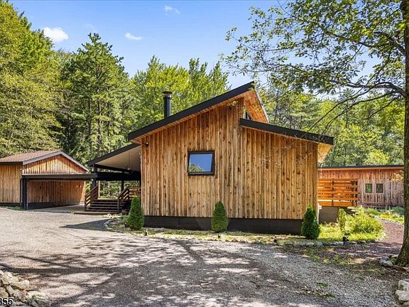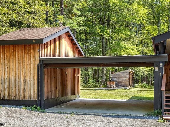 1 Shannon Lane is a sprawling contemporary retreat offering single-level living w/ minimal stairs. Enter beneath the carport through a modern front door, where a covered sitting area invites morning coffee or dinner al fresco. Inside, natural light streams through walls of windows into the open living, dining + kitchen spaces, framed by soaring exposed-beam ceilings and an electric fireplace that add warmth + character. A generous walk-in pantry enhances the kitchen, while a lounge + playroom extend from the main living area, overlooked by a lofted office. Beyond the lounge, a separate laundry room connects to the private bedroom wing. The primary suite, w/ walk-in closet + full bath, sits just off the living area, while three vaulted-ceiling bedrooms in the renovated wing feel airy + inviting, w/ potential for an additional en-suite. Set on 6.68 flat, usable acres at the end of a private cul-de-sac, the property blends privacy + versatility ideal for gardens, farmland, or even horses. A massive deck overlooks the garden and open yard, surrounded by wooded scenery for year-round tranquility. Practical amenities include a tool shed, large wood storage, 200-gallon propane tanks, whole-house generator + a brand-new 4-bedroom septic. A new roof crowns the home's extension, while the location just over a mile to the Appalachian Trail, minutes to the Delaware Recreation Area, and 70 miles to NYC offers the rare balance of seclusion and accessibility.