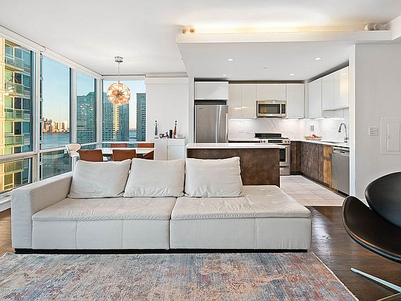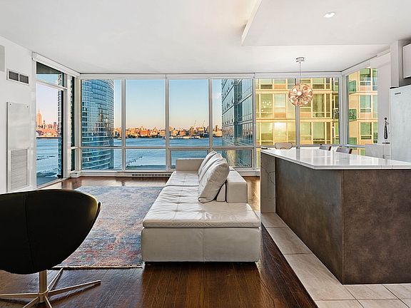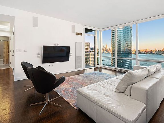 Large Corner East Facing 2 Bed, 2 Bath, Private Balcony with Spectacular NYC/River views. Full of custom upgrades includes: cove lighting in each room, updated kitchen, refinished hardwood floors and built-in surround system. The floor-to-ceiling windows drenches your home with natural sunlight. The Updated kitchen has Brand New cabinets, countertops and backsplash. A living room with a separate dining nook large enough for a full-sized dining table. The luxurious en-suite master bath equipped with a double vanity, stand-up shower in addition to an over-sized soaking tub. Closets with custom built-ins for storage including a master walk-in-closet, custom window treatments, hardwood floors throughout and an in-unit washer/dryer rounds out your perfect new home. All amenities included: 24/7 concierge, fitness center, jacuzzi, sauna, stream room, resident lounge, conference room, playroom and a roof deck with amazing NYC/River views! Conveniently located between the Hoboken & Newport PATH, ferry, light rail, Newport Mall & the Newport Green Park.