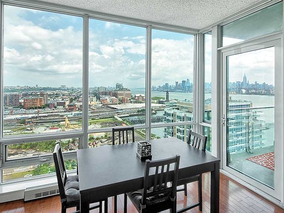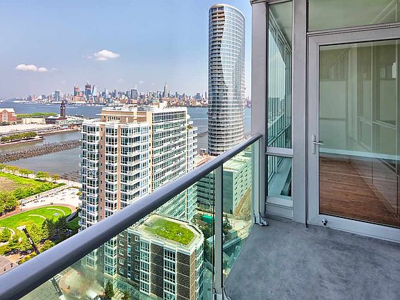 Amazing views from this 25th floor 1,120 Sq. FT 2BR/2BA with balcony in premier luxury waterfront building, 1 Shore Lane. North-Facing exposure with floor to ceiling windows and amazing views of New York City. Home includes chef's kitchen with S/S appliances, granite counter-tops, cabinetry made from custom oak, hardwood floors throughout, washer/dryer in uni, California walk in closet. Building features rood-top deck, community lounge, Conference room, jacuzzi, sauna and steam room, children's play room, gym, 24/7 doorman. Conveniently located near both the Hoboken and JC PATH train station, Hudson-Bergen Light rail station, and Morton Williams Supermarket.