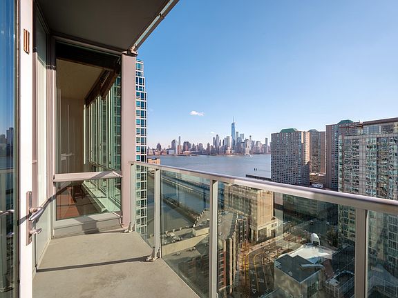 This South facing 1,270 sf 2-bedroom, 2-bath residence features floor to ceiling windows, central heating and cooling, in-unit washer dryer and private balcony with incredible NYC views. Enjoy the open concept layout featuring the kitchen with plentiful cabinetry, open shelving and stainless-steel appliances overlooking the spacious and bright living room, dining area with access to the balcony. The primary bedroom features a massive walk-in closet, additional closet and an en-suite bathroom with double vanity, walk-in shower and bathtub. The second bedroom is flooded with sunlight and across the hall from the guest bathroom with bathtub. The Shore North is an elevator building with 24/7 concierge with amenities including fitness center, jacuzzi, steam and sauna rooms, resident lounge, children's playroom and roof deck. Conveniently located near Newport PATH station, light rail, bus and ferry, as well as the waterfront and some of the city's best restaurants and shops. Rental parking garage options nearby. This home is available for immediate move-in. Heat, hot water and gas included in rent.