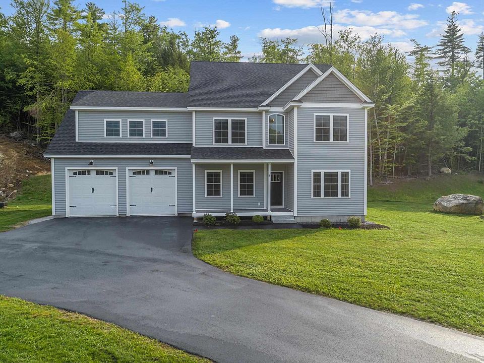 New construction!! Move in ready. Located at Duck Pond Estates in Weare NH on .95 Acres 3235 Sq. ft Colonial with a 2 car attached garage with 9' oversized doors, Farmers Porch as well as a 12 x 16 rear deck both built with composite maintenance free materials. As you enter from the garage, there is a large mudroom, from the mudroom into the kitchen you can feel the open space with the 9' ceilings and open concept into the living room, kitchen and dining room! The kitchen is customized with 42" cabinets, soft close doors & drawers and large 8ft island an a coffee/wine nook. The appliances are upgraded Samsung Caf Line stainless steel appliances. Hardwood treads take you to the second Floor which has 3 large bedrooms and a full bath. As you walk down the hall, past the 2nd floor laundry you enter the oversized master bedroom suite with lots of windows to allow natural light, there is a large walk in closet with custom shelving. The master bathroom has a large custom walk in shower, soaking tub and double vanity sinks. The 2nd floor has carpet in all bedrooms, tile in all baths and hardwood in the hall way. Bonus room in the basement with 575 Sq. Ft. of finished area! This home is equipped with on demand propane hot water heater, 2 zone central ac and heating system, Fully irrigated lawn, all windows have faux wooden blinds, all bathrooms have mirrors, and all closets have wooden shelving! Come check out this listing today!! Move in ready!