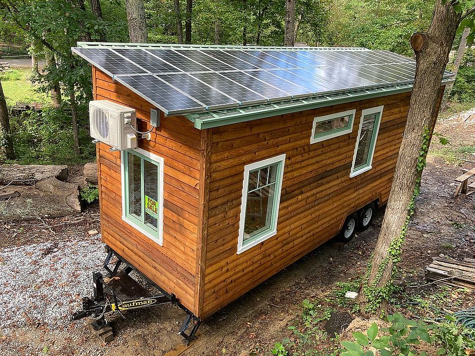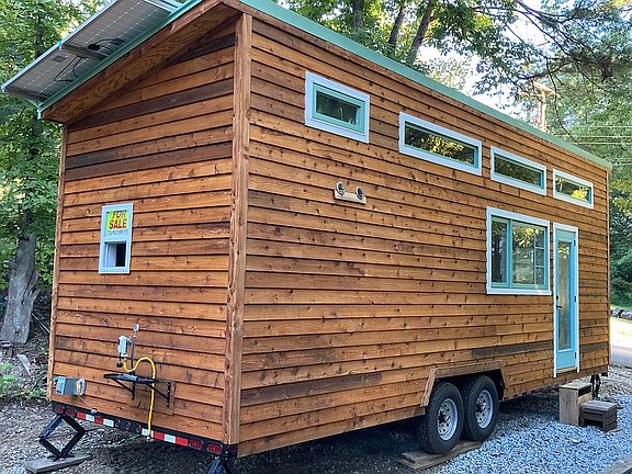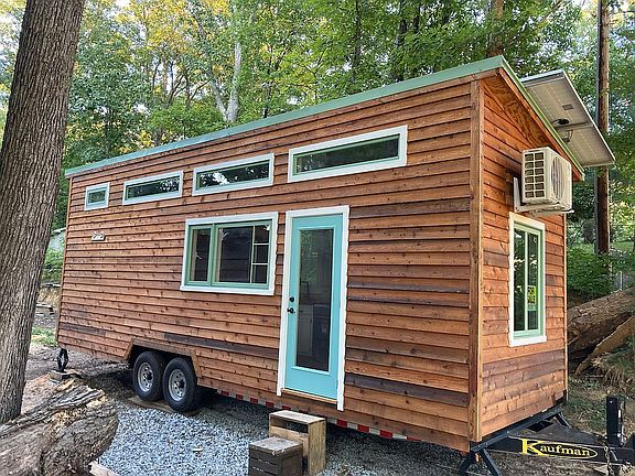 Tiny House on Wheels; Ready to be moved to your lot! This newly constructed tiny house on wheels features a robust solar power system and is designed to be fully off-grid capable. Much of the trim, cabinetry, counter tops, and more are built from wood milled by the builder and air dried for up to two years. The home has a light and spacious feel and should make a very comfortable and reliable dwelling for anyone wishing to embark upon the tiny house lifestyle. Details: Built on new custom Kaufman trailer Main box is 28’4” long x 8’6” wide x 13’4” tall Cedar siding 40 year warranty metal roof Hardwood floor throughout sourced from Stuart, Virginia Fully Solar Powered: -3600 Watts of Renogy solar panels mounted to roof -Renogy 100 amp charge controller -Sungold Power 6000 watt pure sine power inverter -1120aH of Lithium batteries wired in 48v nominal configuration -100 Amp subpanel fed by solar and also by 50amp /220volt RV hookup -Additional 1200 watts of Renogy solar panels available for ground mount (optional) 9000 BTU mini-split keeps the tiny house warm or cool All new appliances (full sized refrigerator, 24” washing machine, 20” four burner propane stove) Propane fired on demand water heater Two lofts: a main sleeping loft 9’x 8’ and secondary loft 7’ x 8’ Full sized bathroom Dry weight is approximately 14,250# (trailer GVWR is 15,000#) $89,500 Buyer can choose either flush or composting toilet. Price is for completed home. Thanks for looking!
