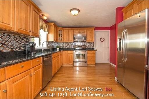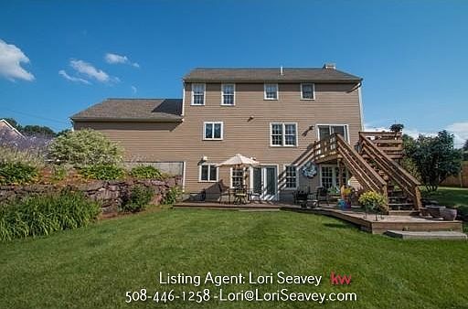 First showing to be at Open House Sunday, July 26 1-3 p.m Contact Listing Agent: Lori Seavey 508-446-1258 or Lori@LoriSeavey.com. Absolutely stunning & located in amazing cul-de-sac neighborhood! Upgrades galore in picture perfect contemporary colonial. Entrance greets you with open staircase & flowing open floor plan. Gleaming hardwoods throughout. Kitchen boast abundance of cabinets, beautiful granite, stunning backsplash and stainless steel appliances. Living room with hardwoods, gas fireplace & french door leading to deck. Ascend the hardwood stairs to Master bedroom with cathedral ceiling, walk-in closet and master bath with tiled shower and double vanity. Two other great size bedrooms & full bath complete the second floor. Basement is ready for a family to spread out, in-laws or teens space. Kitchen with stove & refrigerator, living area, remodeled bathroom & bedroom. French doors lead to a backyard sanctuary. Gorgeous perennials, shed, irrigation, new 30 year architectural roof, gas heat, town sewer and more complete your dream home.