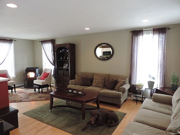 This wonderful home is ready for new owners. Great open concept 3 bedroom Colonial has been well maintained featuring hardwood floors, tiled kitchen and baths. Kitchen offers newer appliances and opens to formal dining room as well as living room...perfect for entertaining guests. Recent updates include freshly painted rooms, new pellet stove, new light fixtures, new ceiling fans, new vanity in 1/2 bath and newer carpets in bedrooms. Great room in basement for hobby/craft or playroom. Wired for generator too! A brand new roof, front walkway, landscaping and freshly painted exterior top the list. All situated on a .52 acre lot with wonderful fenced in yard for kids and pets.