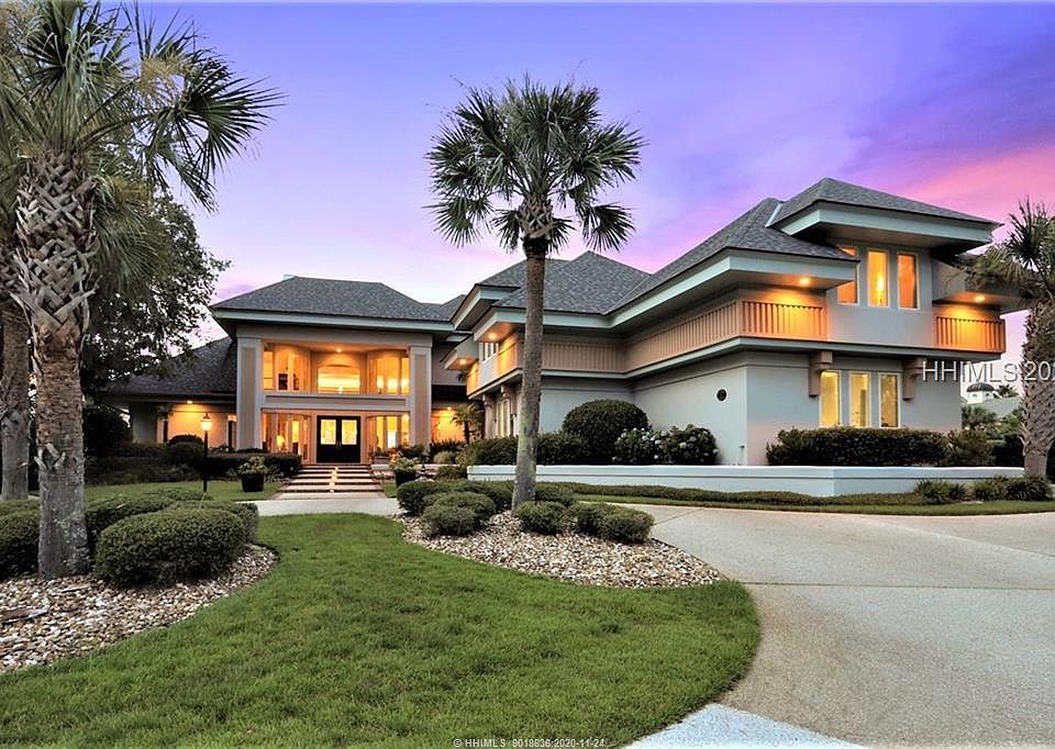 ONE OF BLUFFTON'S FINEST RIVER VIEW ESTATES! Riveting view of Colleton River from this stunning Kermit Huggins architectural masterpiece. Huggins is acclaimed for Bring-the-Outdoors-In designs. This may be his best--steel frame construction enabled huge walls of glass & bright open floor plan. Outdoor living is maximized under extensive covered lanai, gazebo & fountain/mini-pool. Quality abounds: extensive moldings, SubZero & Thermador in gourmet kitchen & luxury MBR w/ expansive marble bath. Special features: home theater, office, river view Carolina room, 4 guest BR's in separate wing. Love water, nature, great architecture? A home with a forever view!