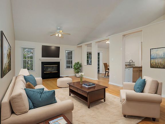 Starter Home - Downsizing - This ONE-LEVEL home, situated on a desirable cul-de-sac corner lot, offers an open floor plan with a variety of updates. Step onto the inviting front porch and into a spacious living area featuring cathedral ceilings, bamboo flooring, and a cozy wood-burning fireplace. The kitchen is great, with granite countertops, tile floors, white appliances, and a breakfast nook. A separate laundry closet with washer and dryer adds convenience. Enjoy the beautifully landscaped yard, or relax in the screened porch overlooking the peaceful surroundings. The home features new windows (2012), a roof (2016), and a new water heater (2023). Vinyl siding, gutter guards, and newer door hardware enhance the home's exterior durability. The primary bedroom boasts a walk-in closet and an en suite bathroom with a garden tub/shower combo. Additional storage can be found in the pull-down attic with some flooring and a finished one-car garage with a second pull-down attic. Woodlake residents enjoy a variety of resources including swimming pool, clubhouse with meeting and exercise rooms, playground, two lakes, and over three miles of paved walking trails, as well as convenient proximity to the Research Triangle Park, Chapel Hill, and Raleigh. Woodlake is located within walking distance of Piney Wood Park, which includes tennis courts, soccer and softball fields, and a dog park. Ready for move-in!
