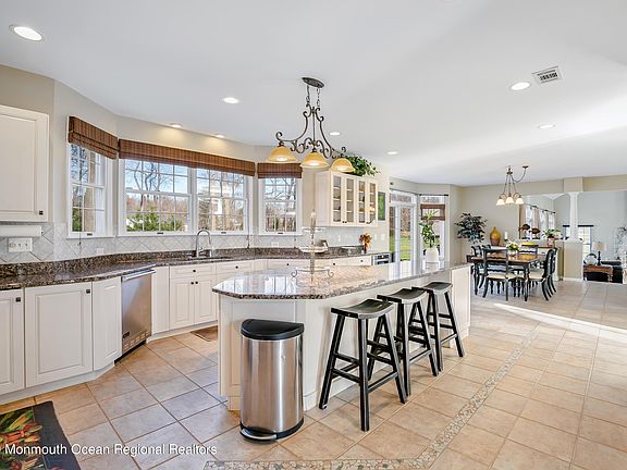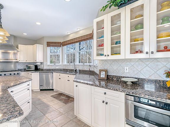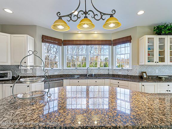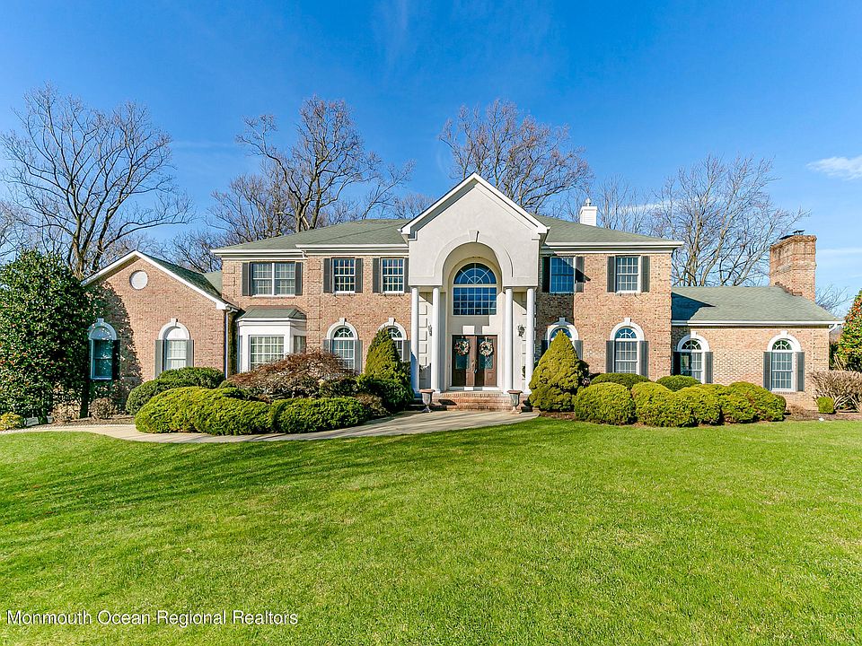 Sophistication abounds this stately 2 story colonial, sleek 5 bdrm nestled along the tree lined streets of pristine Woods Crossing! Bedroom/office 1st Floor with back staircase to upstairs. L/R with sink. Large, Eat-in gourmet kitchen, S/S appliances, large island with abundant sun, neutral paint colors. Charming, tranquil family room with windows galore with stone fireplace! Situated on private wooded flat lot, oak, pine trees along with mature grounds, just minutes from Homdel Park, bus, train & ferry. Located near easiest access from all major highways, beach, restaurants, recreational activities. Desirable Monmouth ratting schools! With hustle & bustle of everyday life; while enjoying BBQ in yard or playing ping pong in basement, make this your tranquil retreat Home away from work!