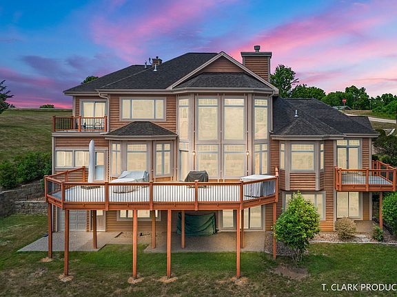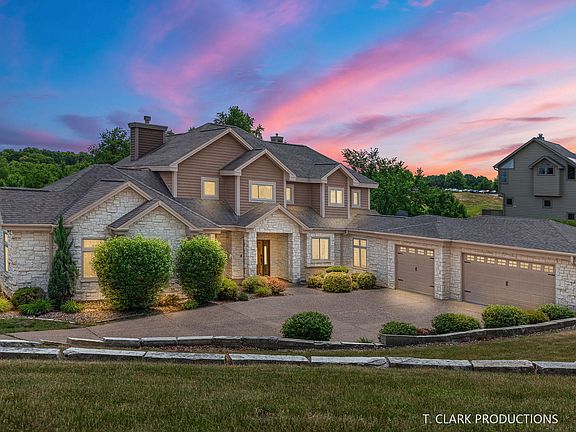 Almost 6000 sq ft of finished living space in this gorgeous open floor plan home retreat located near Galena's Eagle Ridge Territory "General" Golf Course!! Situated on .86 acres surrounded by hills and trees and lovely view of the golf course. The "Territory" has amenities including, shopping, dining, fuel, groceries and more. This home was built in 2000 with no expenses spared and includes 4 all-suite bedrooms, including primary suite on first floor plus 4 full and 3 half baths. Large foyer greets you to custom staircase and stunning 2 story living room with vaulted wood beam ceiling and floor to ceiling windows, stone gas fireplace and sweeping views of deck and landscaping. Kitchen with all HIGH-END stainless- steel appliances, large center island offers counter seating plus eat-in table space, granite countertops & walk-in pantry. First floor mudroom and laundry room plus powder room. Enclosed sunroom off kitchen. Dining room with crown molding, huge bay window and hardwood floors. Private office or den with French door, fireplace and hardwood floors with view of the course and built-in bookcases. First floor hosts huge primary suite with trey ceiling and giant walk-in closet plus door to private deck. Primary bath with heated floors, double vanities plus walk-in shower and whirlpool tub. Upstairs hosts large loft with wet bar and powder room, overlooking living room. Ensuite bedroom with vaulted ceiling private deck, walk-in closet and large bath with walk-in shower and bathtub. Walkout lower level features heated floor, wet bar, fireplace, media room/playroom, 2 additional ensuite bedrooms one with steam shower and private deck. Exterior of home is stone and cedar with 3 car attached garage. Maintenance free multi-level decking. Walkout basement has additional attached storage garage open to backyard. 2 new Furnaces 2023. New furniture in the house is negotiable to stay in home. This beautiful home is a must see!