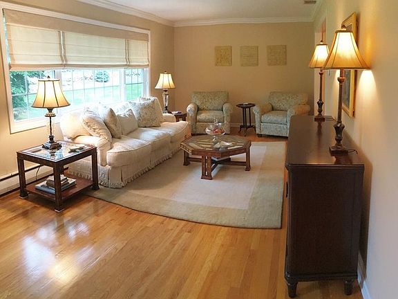 STUNNING UPDATED RANCH in ideal location for commuting or getting around town. The kitchen is immaculate with loads of cabinets, high end appliances and granite counters. Kitchen has sliders to a fabulous deck overlooking a well-kept lawn with plenty of room to relax or entertain. Living room, family room and dining room all have hardwood floors and open onto each other for excellent flow. The large bedrooms also have hardwood floors and plenty of room to fit queen sized beds with room to spare. The lower level is designed for a good time with a designated workout space and entertainment area with wet bar. Lower level also has a half bath and access to the oversized two car garage. This home is PERFECT. Just move in and enjoy your summer!