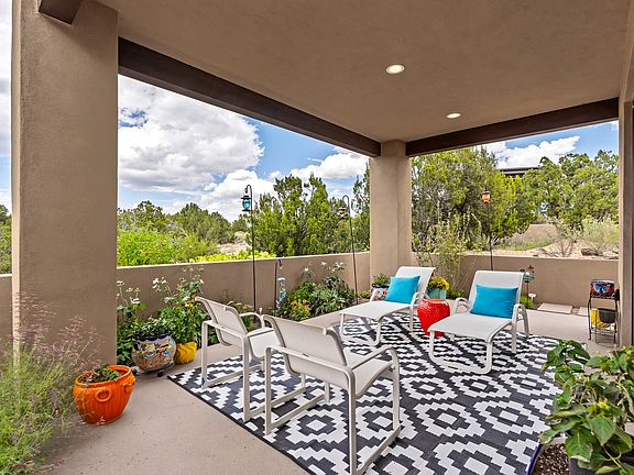 Discover the perfect blend of modern luxury and Southwest charm in this newer home built in 2022 and located in Las Campanas, a premier gated community located just 8 miles from town. Designed in a striking contemporary Pueblo style, the home boasts an open-concept floor plan that seamlessly connects indoor and outdoor spaces, all while framing the mountain views and famous sunsets of Santa. Enjoy multiple professionally landscaped outdoor living areas, thoughtfully designed with water features for relaxation and ambiance. Whether it’s morning coffee, dining al fresco, entertaining or unwinding, this home offers serene outdoor retreats in every direction. Inside, the layout is open and light-filled, with high-end finishes and thoughtful details throughout. The spacious primary suite is a true sanctuary, featuring a generous seating area, a luxurious spa-like bath with a soaking tub, walk-in shower, dual vanities, and an expansive closet complete with built-in organizers. Eco-conscious amenities include solar panels and two electric vehicle charging hookups, offering both sustainability and convenience. The home also includes natural gas, central heating, and air conditioning to ensure year-round comfort. Perfect for full-time living or as a lock-and-leave second home, this property offers the ideal combination of style, efficiency, and tranquility. HOA fees cover road and common area maintenance, 24-hour roaming security, and on-site emergency medical technicians. Membership to The Club at Las Campanas is optional, offering amenities such as indoor and outdoor swimming pools, tennis courts, a fitness center, equestrian facilities, fine dining options, and two Jack Nicklaus Signature Golf Courses.