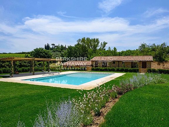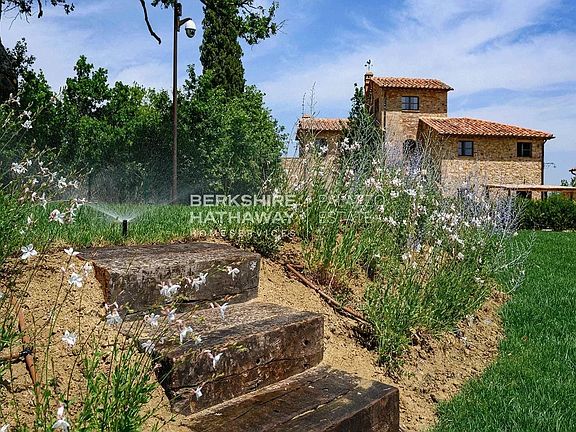 Among the verdant valleys of the Tuscan countryside, a few km from Montepulciano stands the charming Tenuta Lavanda spread over approx. 590 sq m and made up of the main farmhouse and two outbuildings. The property is the result of an excellent renovation with which we have tried to maintain the typical style of the Tuscan countryside, embellishing it with modern details that give a touch of elegance. The main farmhouse is on 3 levels. On the ground floor, we find a large living room with a fireplace, a sitting room, a library under the stairs with an opening compartment, a bathroom with a brick vaulted ceiling, a spacious rustic kitchen and a charming wine cellar with a brick vaulted ceiling. Behind the kitchen, with an independent entrance, we find a comfortable bedroom with an en-suite bathroom. On the first floor, accessed from the external staircase, an imposing oak door welcomes us into a large living area consisting of a lounge and a sitting room with a fireplace and overlooking a terrace from which you can enjoy a 360° panorama. On the same floor, the sleeping area consists of a bathroom and 2 bedrooms, one of which is the master bedroom with a wardrobe and en suite bathroom. On the second floor, we find a turret consisting of a bedroom and bathroom, which is accessed by an internal marble staircase. Outbuilding number 1 is arranged on three floors. On the ground floor, we are welcomed into a small room followed by a service bathroom, a kitchenette and a dining room overlooking a charming pergola. On the first floor, we find a living room with a panoramic terrace, a bedroom, and a bathroom. The basement floor has been used as a technical room, inside which we also find a laundry room and a warehouse. You arrive at dependence number 2, passing through an enchanting gravel path with a path of medicinal plants, organic vegetable gardens and rose gardens whose scents transport us to a parallel reality in which time and space cancel each other out. The outbuilding is on one level and houses 4 large bedrooms with en suite bathrooms. The property includes a beautiful saltwater swimming pool surrounded by travertine flooring and a luxuriant garden from which you can enjoy the romantic view of the historic centre of Montepulciano. All around the property, the 1.5-hectare land hosts 9,000 lavender plants, a 1,000 m2 orchard and 32 piquet olive trees.