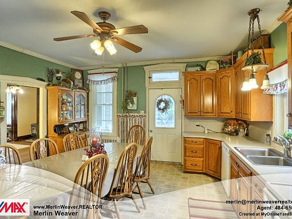 This house has tons of space and potential, needs TLC. 5 bedrooms, 1.5 bathrooms and over 2000 sq ft of blank canvas. Has an attached summer kitchen and large covered side patio. Replacement windows and pellet stove connected to furnace for efficiency. Includes 2 garages, 1 car each, and a storage shed. The garages measure 25x18 and 16x21 and both have electric. The storage shed measures 8x10.