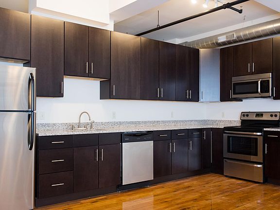 Large, modern loft conversion in historic building. High ceilings, vintage hardwood floors, with lots of light, corner unit. Open plan living, dining, kitchen area. Kitchen has new stainless steel appliances and granite counter tops. Washer/Dryer in unit. Covered parking at nearby city garage included. Storage unit in basement. Tenants have access to a rooftop sundeck and a private gym. Secure building. (Photos of typical unit.) Landlord pays water, sewer, trash - tenant pays electric and cable/internat