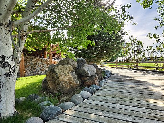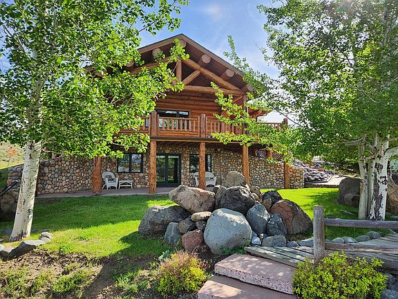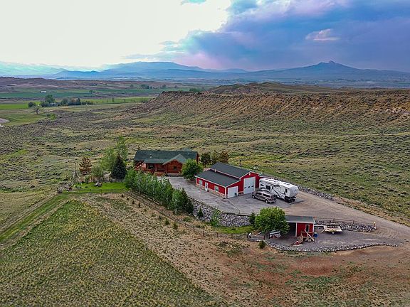Custom skip peeled log home on 11. 66 acres at the end of the road and crest of the skyline. Views for miles and adjacent to thousands of acres of public land. Four bedroom, three bath, central and forced air, wrap around covered deck, beautiful landscaped yard with post and rail fencing, garden and boardwalks. Barn/shop is divided into three spaces: RV garage, Shop, Shop/Office that is currently an efficiency apartment! Custom elk & deer antler chandeliers, custom stone and wood work throughout this gorgeous original log home. Cell tower at the corner of the property is on contract- owners receive monthly lease payment.