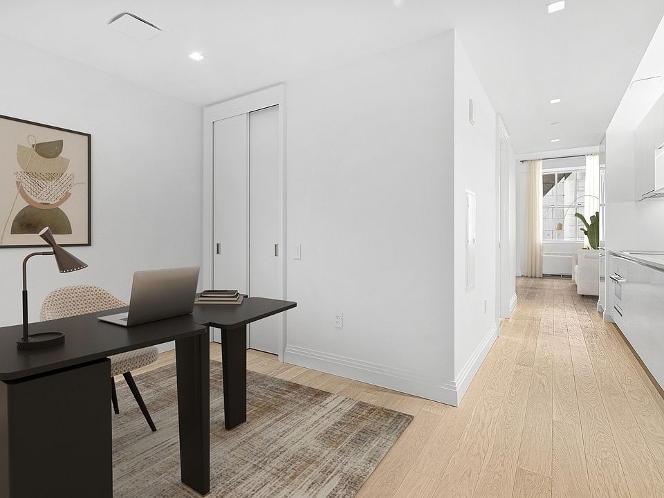 This thoughtfully designed home features wide-plank hardwood floors, a chef's marble kitchen with top-of-the-line Miele appliances, custom cabinetry, and kitchen disposal. The open-concept living and dining area is perfect for entertaining or relaxing, while a separate alcove offers the ideal space for a home office or dressing area.