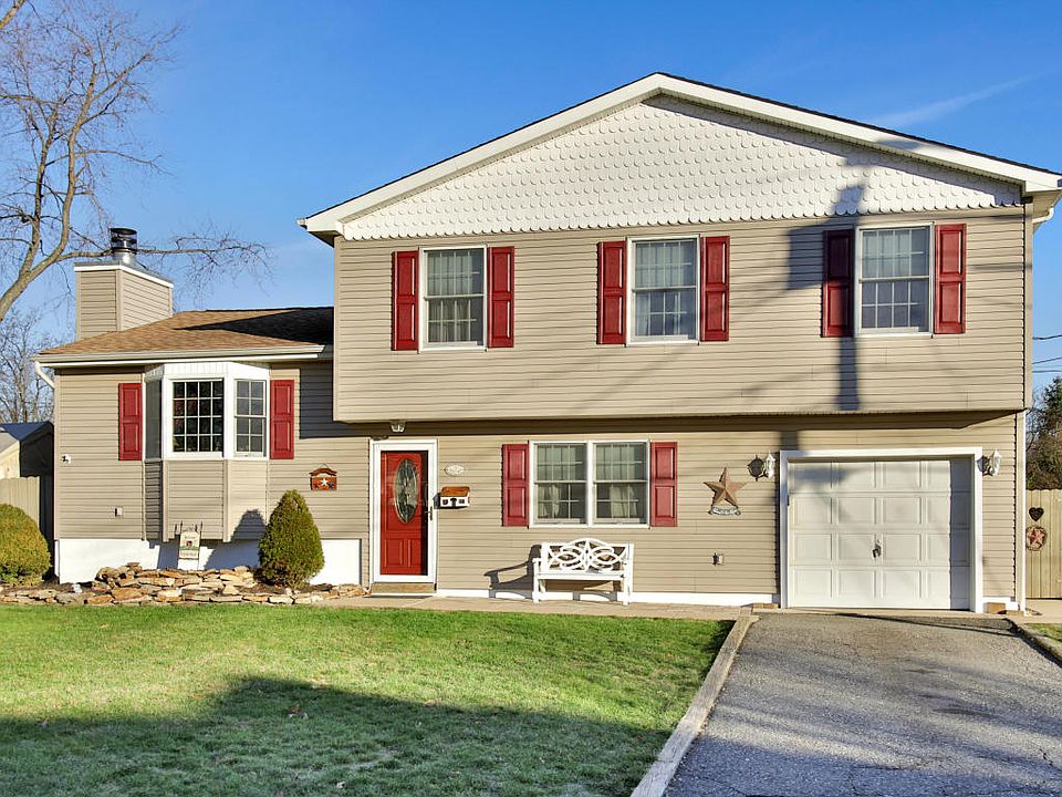 This beautiful Split-level is located in desirable Hidden Hills and boasts a large corner lot. Enter to find proper foyer w/ nice sized family room. LR features wood-burning FP & is open to eat-in kitchen. EIK features ceramic floors, rec lights, built-in cabinet wall & slider to covered deck. MBR is HUGE and features 3 closets. 5th bdrm on first floor is perfect for in-law suite w/ attached full bath. Other upgrades include newer furnace, water heater, dec moldings & two attics! Backyard is large and perfect for entertaining w/ covered deck and heated in-ground pool. Close to public transit to NYC, shopping & area beaches!