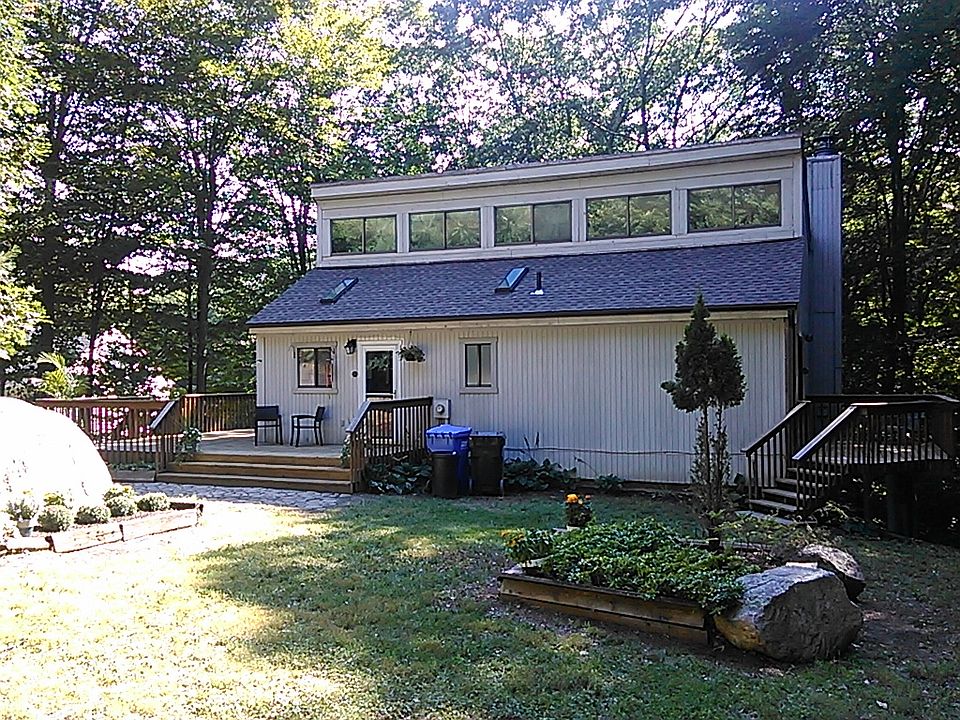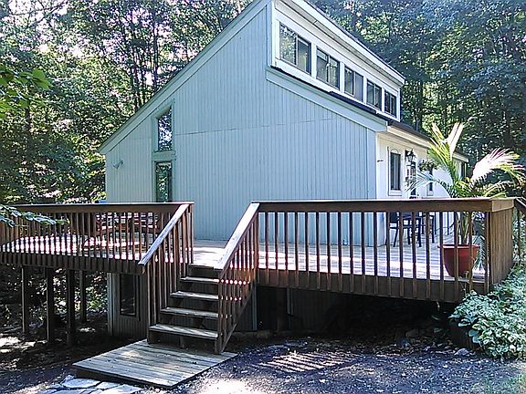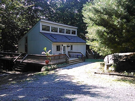 Here is a contemporary saltbox home located on 1.3 acres of land that will give you the privacy you are looking for. The home features a main level master bedroom with full bath, stainless steel appliances, stone fireplace, wraparound deck, loft area, central air and a retractable movie screen. The town card states 936 square feet but the home has a finished walkout lower level that has 2 bedrooms, a full bathroom, and a family room. The oversized 1 car garage has a large workshop with power. This is truly a unique home that you must see today!