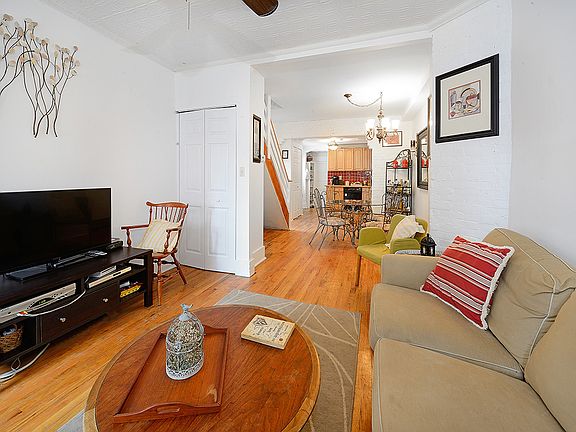 Bright and charming corner townhouse w/parking and large terrace! A single family home for the price of a condo. 4 Bedrooms, 2 bathrooms, hardwood floors throughout and exposed brick add to the character of this cobblestone street home. Perfect guest suite on 1st floor with second entrance and full bath. Stainless steel appliances and butcher block countertop. Entertain and grow a garden on your large deck! Less than a block away: commuter bus to NYC, church square park, supermarket, restaurants and shops.