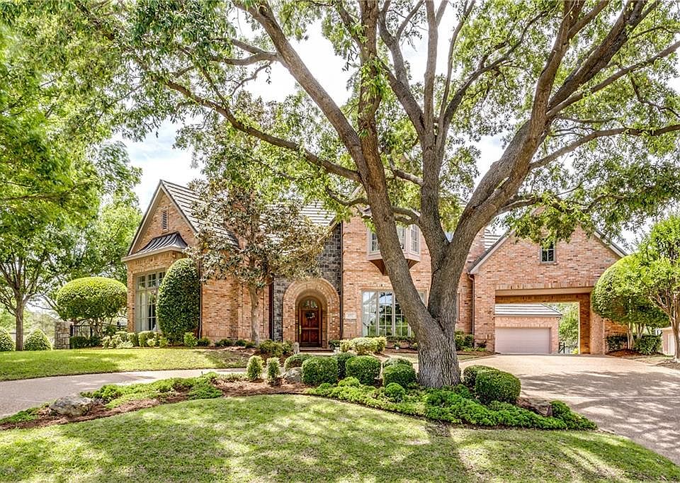 Corner lot in gated community. Classically-designed home with porte cochere,antique brick & stone elevation with turret & stone coated steel roof offers lots of builtins & custom features.Glimpses into several rooms from Entry.LivingRm with tile fireplace,Dining with Butlers Pantry.Stained glass window in Kitchen with granite,island with space for stools,SubZero.Breakfast Nook with hutch,desk.FamilyRm with WetBar.Wood Study with beam ceiling.1st floor Bedroom,Bath.Master Up with sky-lit Bath,jetted tub,marble counters & 2 Bedrooms,Full Bath.Pool with dramatic fountain surrounded by granite,stamped concrete decking,grill area, Patios.Room with HVAC in garage-great for office,Man Cave. with modular furniture.