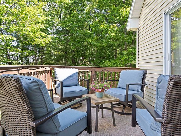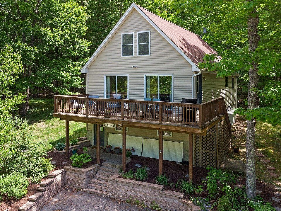 A renovated mountainside chalet-style home nestled in the Lakes Region; this sunny 2-3 bedroom retreat offers a blend of rustic elegance and modern conveniences. The open-concept main floor is perfect for hosting or spending family time; you can enjoy the cozy fire anytime of year with the flip of a switch on the gas fireplace. The bright living and dining areas feature cathedral ceilings and overlook the deck & treetops. Enjoy cooking with a gas stove in the updated kitchen featuring quartz countertops. The LVP flooring throughout the main level is waterproof and highly scratch-resistant. Upstairs, next to the 2nd bedroom, you'll find an open loft area ideal for a guest bedroom, home office, or playroom. The home's impressive Western-facing deck is a great spot to grill, relax, dine, and view epic sunsets over the mountains; you can even see Lake Winnipesaukee through the trees when the leaves fall. The partially-finished basement offers a bonus room, laundry area, and tons of storage. Outside, the shed provides even more storage. You'll love the peaceful wooded town of New Durham granting resident-only access to pristine Merrymeeting Lake, while nearby in Wolfeboro you can explore endless shops, restaurants, & breweries on the shores of Lake Winni. Outdoor enthusiasts will love the local network of hiking/walking/biking/XC/snowmobile trails, proximity to many lakes, and local ski mountains Abenaki & Gunstock. The property also boasts a strong short-term rental history.