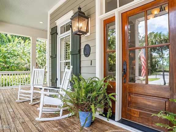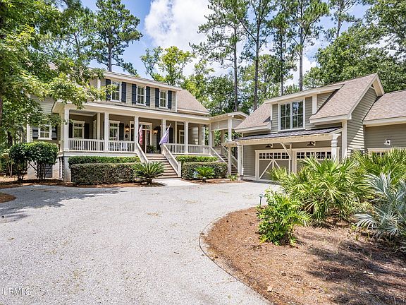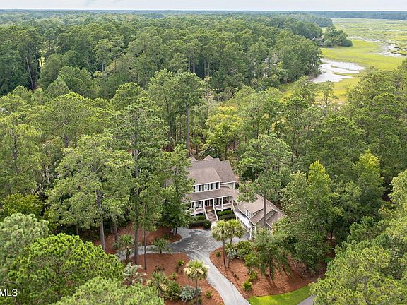 Situated on a double lot and surrounded by majestic oaks and swaying palm trees, this property is your own private oasis nestled in the heart of Callawassie Island! No expense was spared when building this custom lowcountry home by Steve Tilton. Offering multiple gracious living spaces and detailed craftsmanship from the coffered ceilings, with custom trim and woodwork, to the reclaimed heart of pine flooring throughout. This is a truly ''smart'' home featuring a newly upgraded in 2018 Crestron Home Automation System that gives you the power to control the HVAC, lighting, security, and audio/video at your fingertips while both at home and away via smartphone. The open floor plan provides plenty of space for entertaining with a great room, chef's kitchen, breakfast nook, full bar and dining area. The kitchen features custom Peacock cabinets, a large island, and stainless steel appliances. A full bar with granite and pine countertops is thoughtfully situated between the great room and kitchen with wine and beverage coolers, custom cabinetry, a pounded copper bar sink, and space for bar stool seating. From the great room, you can access the fully screened porch, complete with a gas fireplace making this space enjoyable year-round or the rear porch with views of the pond and marsh. The first-floor primary suite features tons of natural lighting and its own en-suite bathroom. The primary suite bathroom includes a walk-in shower, jetted tub, double vanities and a spacious walk-in closet. Upstairs, you will find three additional bedrooms. Two bedrooms feature their own full bath en-suite, and the 3rd spacious bedroom is perfect for an office or guest space. The second floor gathering area is a wonderful space for a home theater or second living room with a wet bar, powder room, and access to the rear balcony deck overlooking the private pond and views of the marsh. There is additional living space in the guest suite over the detached 2 ½ bay garage. Comprising 475 sq. ft, this studio-style guest suite is complete with a living area and full kitchenette, as well as one full bathroom with tub. This home boasts over 1,200 additional sq ft of outdoor living space to enjoy spectacular views of the pond and marsh while taking in the lowcountry breezes from the oversized covered front and rear porches, screened porch, and 2nd story deck. The yard features a multi-zone irrigation system, brick pathways, a patio with custom fountain and firepit, as well as lush foliage and mature trees. Conveniently located mid-way between Beaufort and Hilton Head Island on Callawassie Island, this gated island community offers a Clubhouse, River Club, fitness center, two swimming pools, kayak docks w/storage, six Har-Tru Tennis courts, walking trails, 27 holes of Tom Fazio designed Golf courses and 24/7 gated and guarded security.