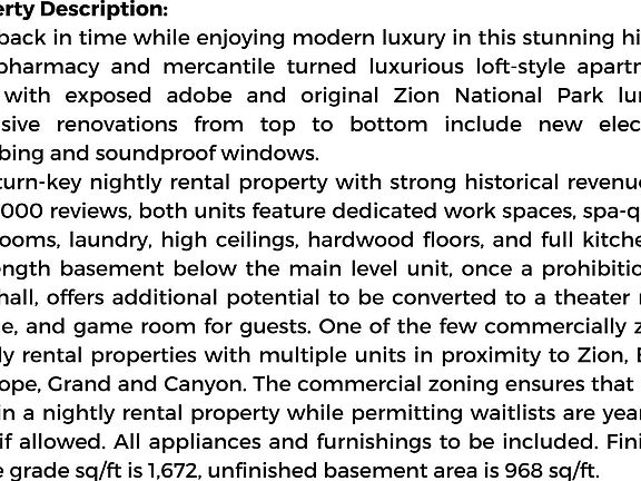 As a turn-key nightly rental property with strong historical revenue and over 1000 reviews, both units feature dedicated work spaces, spa-quality bathrooms, laundry, high ceilings, hardwood floors, and full kitchens. A full length basement below the main level unit, once a prohibition-era pool hall, offers additional potential to be converted to a theater room, lounge, and game room for guests. One of the few commercially zoned nightly rental properties with multiple units in proximity to Zion, Bryce, Antelope, and Grand Canyons. The commercial zoning ensures that it can remain a nightly rental property while permitting waitlists are years out even if allowed. All appliances and furnishings to be included. Finished, above grade sq/ft is 1,672, unfinished basement area is 968 sq/ft.