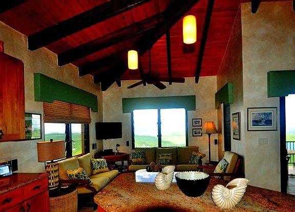 Lunazul, nestled high on the Bordeaux Mountain hillside offers what are arguably the best down island and high water views on St John. Ranging from Sandy Cay at the north, down the Sir Francis Drake Channel and British Island Chain to the East, and to Flannagan Island looking Southeast over the Caribbean Sea the panorama is remarkable and ever changing. The property offers fully paved access and features two separate stand alone 2 story homes of solid masonry construction. The upper villa has a great room with gourmet eat-in kitchen, living and sitting areas and powder room. The great room opens onto a covered wrap-around living and dining porch. The lower level houses two bedrooms with baths en-suite. Each opens onto a covered porch that extends to a sundeck surrounding a solar heated pool.A stone and brick walkway leads to a second 2 story home with its great room that houses a gourmet kitchen and living area. To the left of the great room is the master bedroom and en-suite bath with beautiful stone shower. All rooms at this level open onto a covered living and dining porch. Below is a second bedroom suite that has its own private open sitting patio. Both homes exude an old world charm with their stucco exteriors. Interiors feature Italian tile floor coverings, Brazilian granite countertops and hardwood cabinetry, all professionally designed and beautifully finished. The kitchens are outfitted with upscale stainless steel appliances and all rooms furnished with a tasteful mix of contemporary and eclectic furniture.