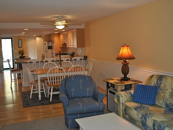 Relaxing Retreat! This 3 bedroom 2 bath condo unit welcomes you with an open kitchen/dining/living area adorned with wainscot paneling and tasteful furnishings. Kitchen offers plenty of cabinetry space, center island and a breakfast bar. Master suite features custom built-ins and a full master bath complete with Jacuzzi style tub. Enjoy the ocean breeze from your private balcony that is just steps away from the beach! Conveniently located close to shopping and restaurants. A must see!