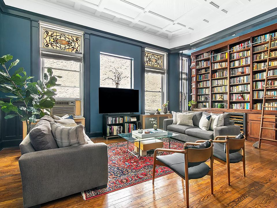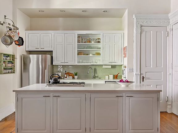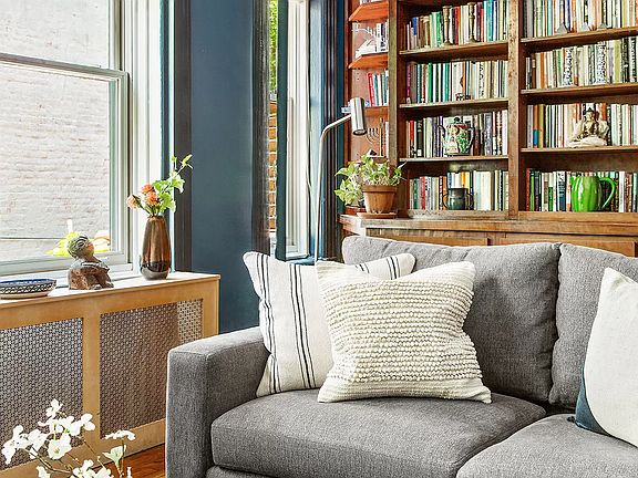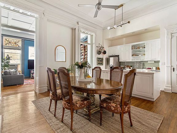 10 8th Avenue, #2 This exquisite parlor floor home resides in an intimate co op located on Sportsmen's Row, the blocks of 8th Avenue between Flatbush and Lincoln places and earned its moniker when early residents included jockey James McLaughlin and other local, well known athletes of the era. The parlor home at 10 8th Avenue will astound you with its lovely pre war features including soaring 15 foot ceilings, stunning original stained glass panels and millwork, oversized "Citi Quiet" windows, exposed brick, and the original fireplace mantel in the dining room. The updated kitchen with freshly painted cabinets and pale green glass mosaic back splash is the centerpiece of the home with ample room for formal dining. A few steps up lead you to an efficient mezzanine space currently used as a home office that would also make for a terrific guest room or play area for the kiddos. The living room with endless bookcases, over-sized dramatic door ways, and handsome coffered plaster ceiling is sure to enchant. Down the gallery hall find full sized laundry tucked away, a renovated full bath, the sunny primary suite and the 2nd bedroom. The primary is enormous and beautifully appointed. The ensuite spa bath is built for two with double sinks and artesian glass tile surround. 10 8th Avenue is perfectly located at the end of 8th Ave, close to amazing provisions and resources including Soul Cycle, Union Market, Fausto, and James restaurants. Nearby transportation, the Barclay Center, Brooklyn Museum and Library and, Prospect Park are all at you fingertips.