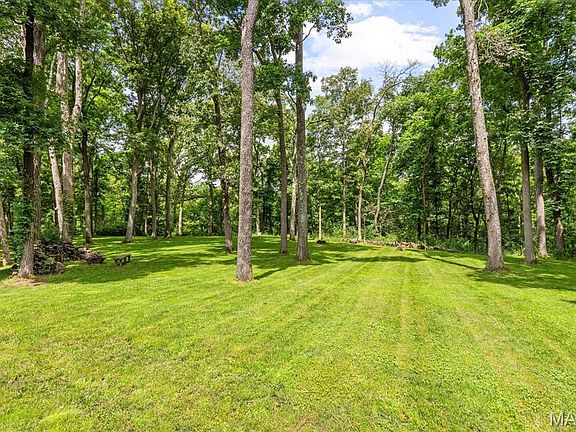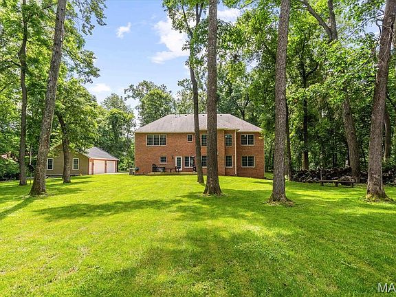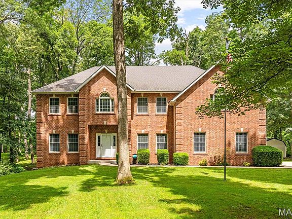 Nestled on 3.85 wooded acres in the peaceful Algonquin Forest of Millstadt sits this custom built, ALL BRICK, 2 story home offering 6 bedrooms, 4 full baths, and an impressive six garage spaces, ideal for car enthusiasts or extra storage. Inside, your entry foyer is flanked by formal dining room along with dedicated office behind French doors. A main level bed and full bath allow for versatile living. A soaring two-story living room fills the home overlooking the wooded backdrop. Expansive chef’s kitchen is the heart of the home, boasting quartz countertops, a walk-in pantry, and premium custom dovetailed cabinetry—designed to impress and built to last. Upstairs, all bedrooms feature direct bathroom access, combining comfort with convenience. Massive laundry room is located on upper level as well. The 9-foot pour walkout basement offers endless potential for customization to suit your needs (plumbed for bath and egress in place for additional bedroom). Zoned heating/cooling for added convenience. Spacious backyard features an abundance of flat, functional greenspace surrounded by mature trees (large shed for additional storage). Enjoy privacy, space, and high-end features in a tranquil, wooded setting. This one-of-a-kind property offers the best of privacy, upscale living, and modern conveniences.