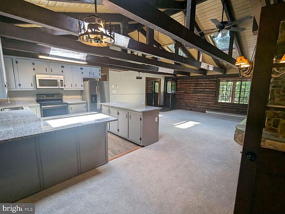 Welcome to this magnificent log home that is situated on a gorgeous 2.04 wooded acres. This home boasts spectacular mountain views from the front porch. The first floor is an open concept centering around a beautiful stone fireplace with a lovely upgraded kitchen; perfect for entertaining. The laundry area is conveniently located right off the kitchen as well. The master bedroom is spacious, with a walk in closet, and ensuite bathroom with walk in shower. There is additional 3 bedrooms and a 2nd full bath. The home has attached garage and work space. Beautifully remodeled and ready to move in. Driveway is updated, and a metal roof with skylights, granite kitchen countertops, pellet stove with a touch screen controller, front porch and rear sunroom.