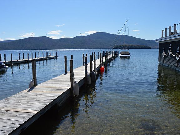Spacious in town home with beach and dock for 20' boat. Park your car and walk to the shops and restaurants in downtown Bolton Landing. Home has view of the lake and mountains and a brook runs along the boarder. There is a master suite on the first floor and an enormous master suit on the 2nd floor with a sitting area with stone fireplace, whirlpool tub, private porch overlooking the lake, vaulted ceiling, wood stove, giant walk in closet with a storage room. Lots of skylights throughout the 2nd floor. On the lower level is a spacious family room with a wood stove, wet sauna, and dry bar. There is a deep one car garage. This house sits back with a lot of privacy. It is a wonderful year round home.