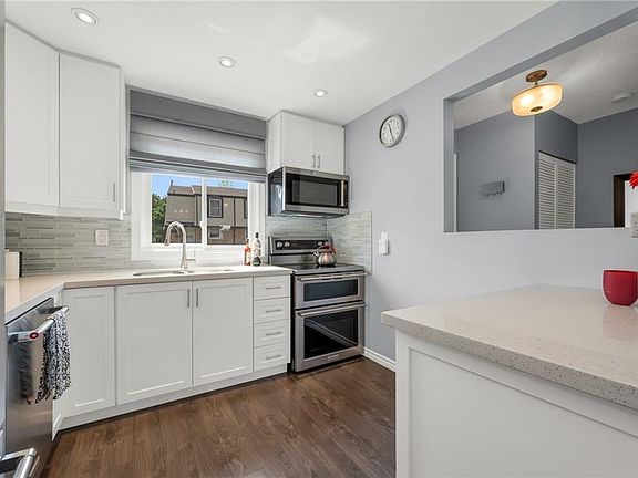 Welcome home! Experience modern low maintenance living with impeccably styled finishings throughout this fully renovated 3 bdrm 2 bath townhome that backs on to a park-like setting! From the moment you arrive, you can truly see the pride of ownership that is evident throughout! Inviting curb leads you into the open concept floorplan flooded w/ natural lighting and modern flooring throughout and features a large living room w/ fireplace overlooking the separate dining area w/ custom-built in Baresa Kitchen cabinetry that continues into the elegantly appointed kitchen w. Quartz countertops and premium stainless steel appl's. The upper bdrm level features 3 spacious bdrms all with modern flooring and accents and large 4-piece bath. Steps down to the finished lower level offering a separate entrance direct from the garage and offers a spacious rec room w/ modern tones, a 3-piece bath, storage and laundry! Step outside to your own fully fenced private backyard offering a low maintenance space to host guests and leads direct to the rear greenspace with nearby park! Updates include: Flooring, Kitchen, Baths, Windows, Doors & more! Furnace (2015) & A/C (2017). Parking for 2 cars in driveway! Nestled close to all major amenities, easy hwy access & nearby schools, parks & more! This meticulous home has been lovingly maintained and it shows - A MUST SEE to truly be appreciated. Don't miss out!