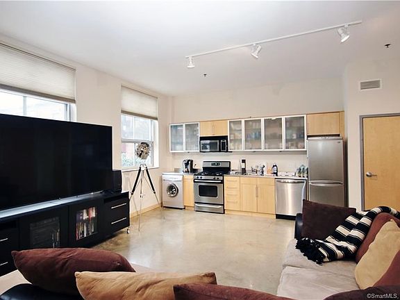 Sophisticated contemporary condominium at the trendy SoNo Lofts. One of only four units that offer two floor living. This unit includes one bedroom, one and a half baths with an open floor design boasting ten-foot ceilings and eight-foot windows. The kitchen includes stainless steel appliances and an in-unit washer/dryer. The cozy lower level features a bedroom and spacious bathroom with ample closet space. Central A/C and gas heat. Close proximity to everything, your options are limitless. Close to highways, South Norwalk train station (Metro-North), Maritime Aquarium, shoreline, theaters, museums, top rated restaurants, and night life. One garage parking spot along with a fitness room, storage, and bike storage.