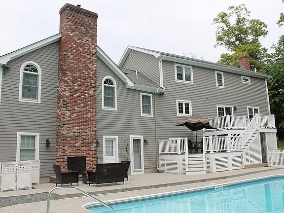 Sited in Squinn Brook Estates, this Colonial style residence is set back from the road w/professionally maintained grounds. The large eat-in Maple kitchen w/granite counter tops & large center island, offers an open concept leading to the formal living room with fireplace, dining room and sliders leading to a double tier composite deck. The 2nd floor offers 4 bedrooms w/recently installed hardwood flooring w/the master bedroom offering 2 walk-in closets and newly renovated bath. The great room above the garage(624 sf) offers vaulted ceilings, skylights & additional fireplace. The heated finished basement offers a rec. room & 3/4 bath. Additional features include central air, irrigation, composite farmers porch, composite decks, stamped concrete patio with fireplace overlooking a heated 18' x 36' in-ground pool. Excellent quality and craftsmanship with many recent renovations.