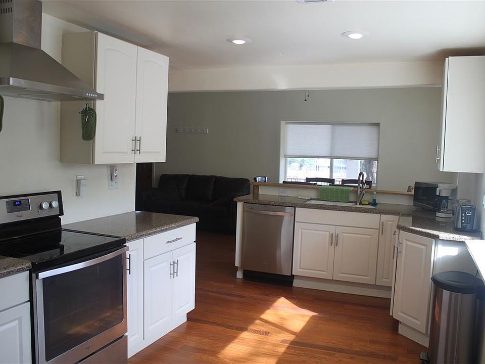 Beautiful home in the center of town, wood floors through all living area and carpet in bedrooms, laundry in unit, walking distance to all amenities. Stays cool in the summer with thick adobe walls and has central heating for the winter. The three bedrooms are connected so could also be considered a 2 bedroom with a den. Call for more information. Available partially furnished if desired. 1 year lease, water, internet and trash card included, pets okay, max 2, max 1 large. $50 extra per month for pets.